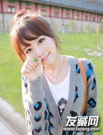 长发扎起一个可爱的花苞头,清爽又显嫩,萌萌的韩式齐刘海自然修饰着脸蛋,尽显纯纯的学生妹气息。