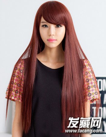 酒红色的时尚染发,很衬美眉的洁白肤色,再搭配唯美的韩式长发直发披肩,更是一款气质十足的修颜发型,很潮,很有魅力哦!