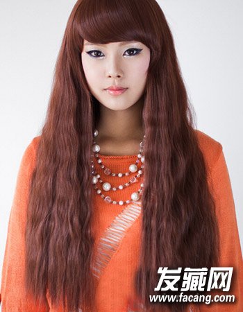 厚重的韩式斜刘海发型,搭配唯美的长发设计,打造一款时尚气质的披肩长发造型,再加上酒红色的染发颜色,更显美眉的时尚气质。