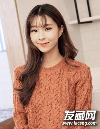 首先介绍的是一款很显清新甜美风的女生可爱长发发型,这种只是简单的将自然的长直发染上时尚的咖啡色发色,再与清新的韩式空气感刘海相搭,微显凌乱感的自然长发造型更显女生的甜美可爱感。