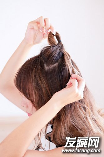 1,绑起头顶少许向后一些的发束,在打结处空出洞让发梢穿过,卷起来。