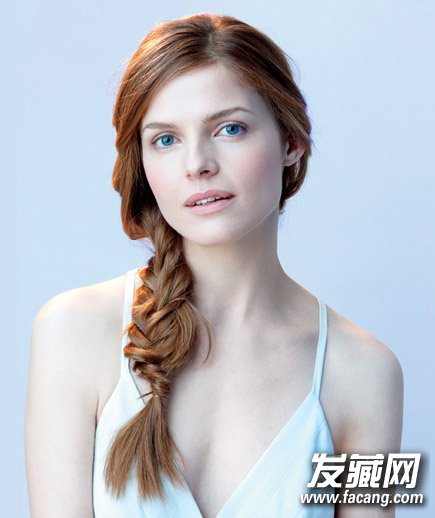 鱼骨辫编发发型,将长发编成一条辫子,脖子一下的鱼骨辫让发量看起来增加了很多,发尾部分收紧是造型关键。