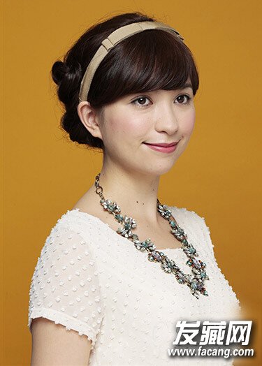 高耸的盘发露出细长白皙的脖颈,展现出干净清爽的气质。厚重的刘海搭配款发箍造型,优雅动人。