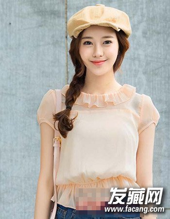 同样是无刘海的造型设计,再配合这种简单清新的栗色染发,而简单的侧边辫子编发发型与一顶浅色系的帽子相搭更还有清新田园风。