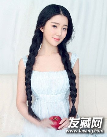 非常可爱甜美的一款发型设计,及腰黑色长发扎成两条,麻花辫,垂在胸前的辫子展现女生淑女气质,清新唯美。