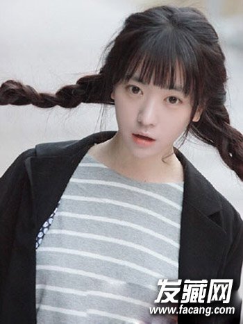 长发女生们最爱的一款学生发型设计,乌黑莹亮的质感长发扎双麻花辫发型,搭配蓬松的刘海,修饰出可爱的巴掌脸。