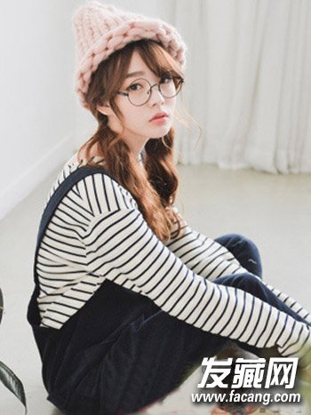 双马尾发型也是软妹纸必不可少的一款校园发型,烫卷长发柔顺飘逸,扎双马尾发型,搭配帽子和眼镜,甜美娇俏的韩式学院风校园发型设计。