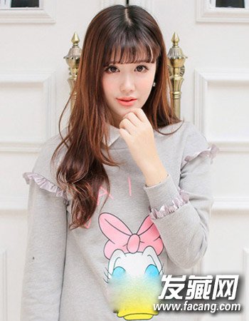 很显甜美粉嫩感的一款鹅蛋脸女生适合的长发设计,利用的是简单自然的空气感刘海发型设计,再配合这种飘逸的长发设计与发梢微显蓬松的烫发造型更添十足粉嫩可爱感。