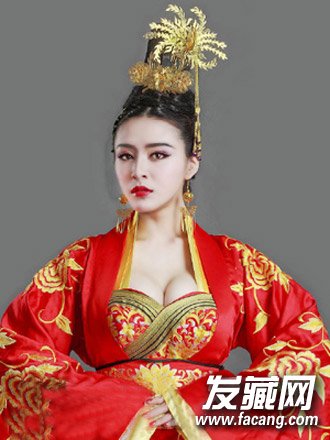 伍娇身穿唐装造型,显露性感的身材,小脸尖下巴,高高盘起的发髻,金色的高贵发簪点缀,高贵端庄,颇有宫廷风。