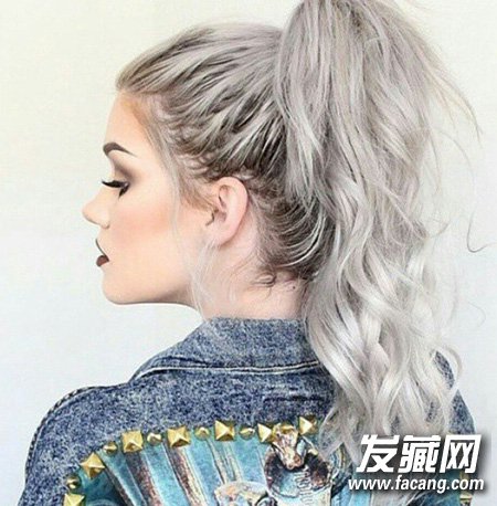 活力十足的马尾辫发型,马尾辫可是说是长发妹子最常用的发型之一了,这样将长发扎成高高的马尾辫,卷发加上“奶奶灰”染发颜色,很显神秘气息。