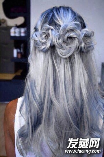 甜美花朵编发发型,蓝紫色和灰色的渐变色染发让长发变得很吸睛,加上花朵编发形成浪漫公主头,瞬间迷倒众生!