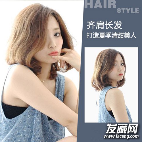 刘海呈波浪形自然包裹住秀美的脸蛋,及肩长发露出性感锁骨,淡褐色的头发蓬松感十足。整体造型休闲慵懒。