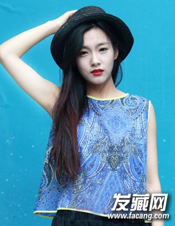 柔顺的侧边长发直发打造出个性与时尚的一面来,侧边长发与个性的挑染显得更加有气质,搭配上帽子时尚大气。