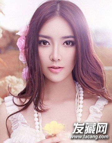 亮丽的紫棕色长发在梦幻的场景下,浪漫可人,中分的刘海呈现出最佳轮廓,粉嫩的花朵让你更加迷人。