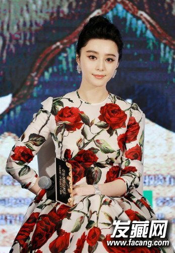 之后的印花裙造型,华丽的花朵图案凸显复古气质,搭配这样一款高发髻造型更是惊艳,即使没有任何发饰修饰,也不曾被服装花了眼,感觉范爷的脸到哪里都是发光体。