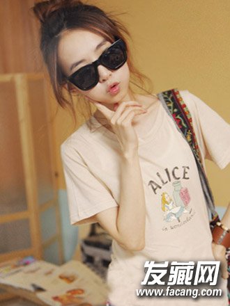 夏天MM经常打理的一款简单夏季发型扎法,扎到发顶的高发髻造型最是显清凉,前额留出长刘海鬓发修饰脸型清新瘦脸。