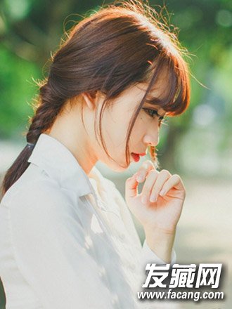 很有田园风的一款夏季简单发型扎法,挑染色的中长发编蓬松感麻花辫发型,清新的齐刘海发型扎发很有小清新气质。