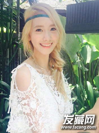 这款靓丽清新的简单发型扎发也是当下非常热门的一款韩式发型扎发,侧分的中长发在一边颈间扎低蓬松感十足的低麻花辫,搭配发带绑扎更显甜美。