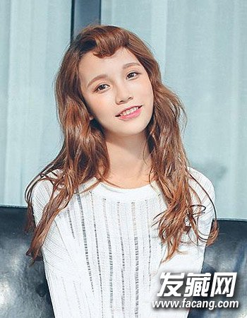 以时尚的棕黄色染发颜色为主,再配合这处内扣形式的卷发刘海造型与微显凌乱感的长发烫发设计同样很显萌妹纸的活泼甜美风。