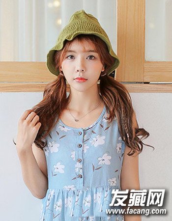 利用的是时尚的棕红色染发颜色来衬托出女生肤色的拍板红润感,而简单的双马尾扎发与长卷发的设计更添的清纯萌态感。