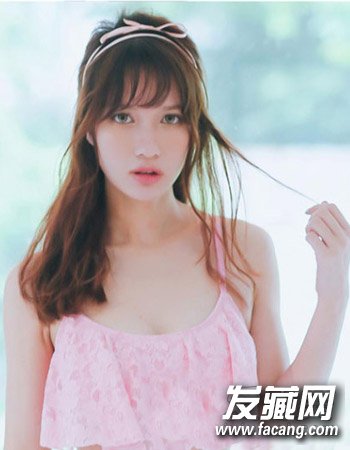 斜刘海形式的空气感刘海不仅可以增添女生的灵动气质感,而且还显上温柔淑女风,与棕色的长发发梢烫发和简单的发箍造型同样萌态十足。