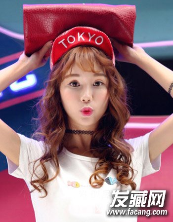 简单的利用的是内扣形式的空气感刘海造型设计来增添女生的甜美可爱风,而棕黄色的染发颜色与微显蓬松式的中长发烫发造型同样活力感十足。