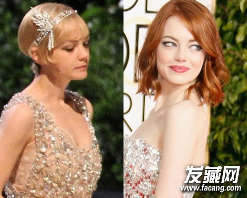 比如上图盖茨比里的Carey Mulligan(左)脸型还是比较尖的,留这种精灵短发就很美,但Emma Stone(右)的脸是比较方的,就需要用Bob头遮一遮。(如果Mirranda Kerr留短发的话应该也需要这样。)
