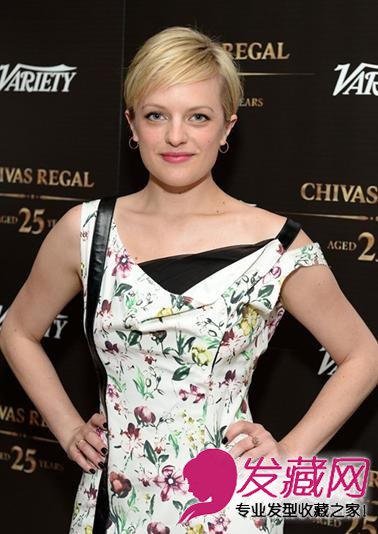 Elisabeth Moss的铂金色短发结合了现代发色和经典发型。