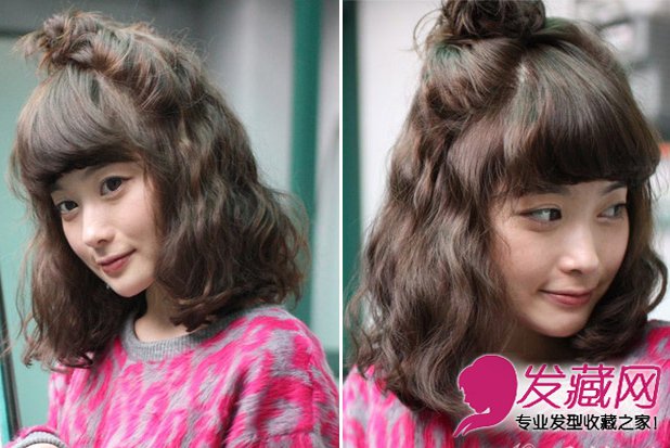 编辑点评:发量偏多的妹纸们可以试试这款短发蛋卷头哦。泡面式的烫发打造出蓬松饱满的发感,在头顶扎一个小小的花苞,宛如邻家妹子般清纯可爱。