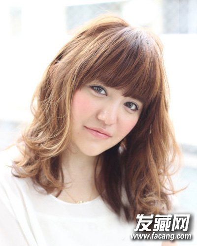 蓬松的微卷烫发造型,搭配上气质薄刘海,轻松勾勒出一张精致的小脸,棕黄色的染发衬托出白皙的皮肤,显得mm颇有甜美气质。