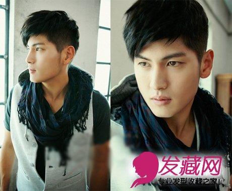 男生二分区式发型,干净利落,硬朗帅气,斜分的碎刘海自然有型,搭配时尚感的围巾儒雅男生风味十足。