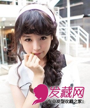 可以选择将蛋卷长发变成侧编的鱼骨辫造型,加以发饰和刘海的刻意修饰,变得甜美加倍