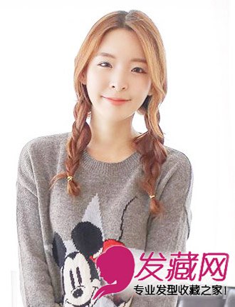 简单的米奇毛衣,纯真的学妹范,棕色的长发编上松散的麻花辫,俏皮瘦脸,可爱感提升。