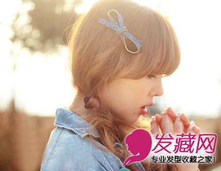 很甜美的一款韩式发型扎法。厚重感刘海轻松的打造出女生温顺的一面,轻柔温婉。点缀上发饰颇显甜美感,十分有美感。