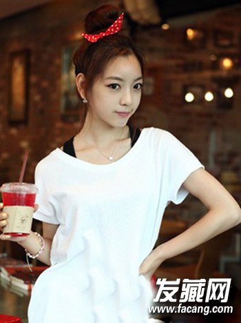 韩式简单花苞头盘发发型,无刘海的露额高发髻扎发清爽利落,蓬松的发髻搭配挑染发色更显潮流气息。