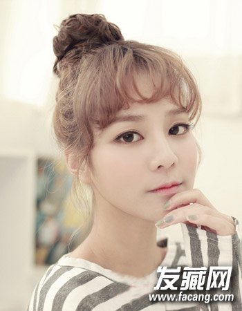 喜欢扎发的妹纸们不防再来看看这款简单的可爱韩式扎发发型,只是简单的将长发进行高耸的丸子头我盘发,再与清新的空气感卷发刘海相搭,而亚麻色的染发更显小女生肤色的白皙与可爱甜美的气质感。