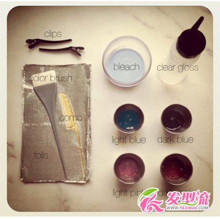 需要的工具有尖尾梳,发卡,上色刷,锡箔纸,适量头发漂白剂(请咨询专业染发师),亮粉和艳粉染发膏,以及亮蓝和深蓝染发膏。