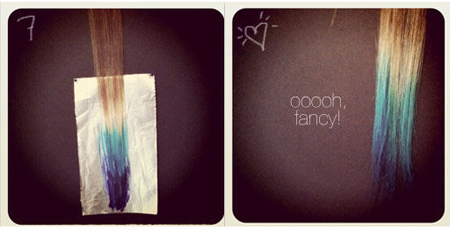 图7在靠近发梢的1/3的位置再抹上深蓝色染发膏。这样能达到,金色、浅金色、淡蓝色、深蓝色的渐变效果。并以同样方法给其他头发抹上浅粉色和玫色。