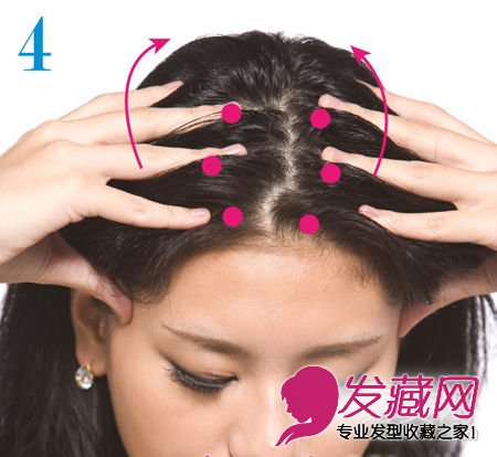 拇指放太阳穴当施力点,其它四指放分线处,往后移动头皮3次。