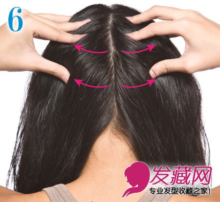 手指成熊爪状,把大拇指放在后脑杓发际线(像抓住後脑),往上“抓龙”至头顶。