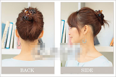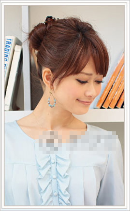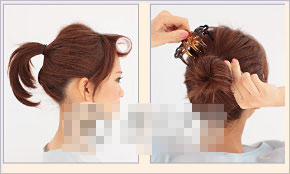 2.将头发拧结缠绕,形成发圈。收好发尾,用发卡固定好。
