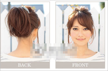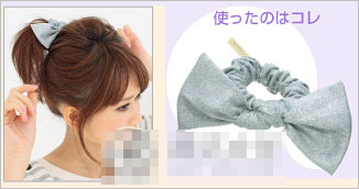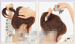 2.将上层头发与下层扎好的头发合并,用蝴蝶橡皮圈扎好。注意顶端的头发不要太贴。