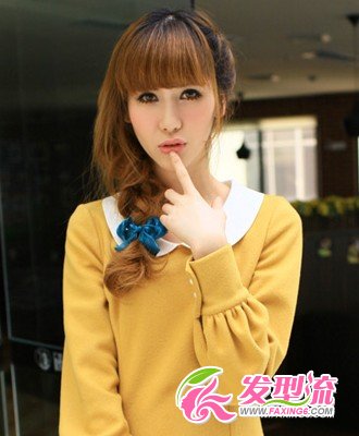 厚重的齐刘海让双眼突显明亮,蓬松的卷发编成一束麻花辫,斜搭在胸前,营造出性感迷人的气质。发梢利用蓝色的发带点缀,让造型更显可爱俏皮。这款邻家女孩般的可爱发型不容错过哦。