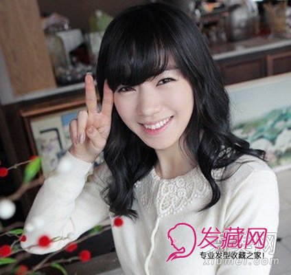 刘海似乎已经成为了女生掩饰脸型缺陷不可或缺的选择!半月形的刘海能修饰出完美的侧脸轮廓,令五官看起来更加清秀且柔和。中长发制造出卷发的弧度更具女性魅力,此款发型很适合走温柔路线的女生,无形中散发出亲和力让人忍不住很想接近。
