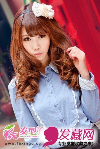 偏分的弧形刘海,凸显出了美眉精致的五官,蓬松感的卷发紧贴脸颊,修饰出小脸,精美发箍的搭配,打造出了一个淑女的小美女形象。