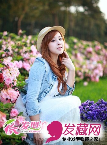 斜分刘海卷发发型,露出光洁的额头,让女生的五官更显立体。棕色的染发非常抢眼,搭配编织的草帽,弥漫着浓浓的田园气息,很是适合出门踏青。