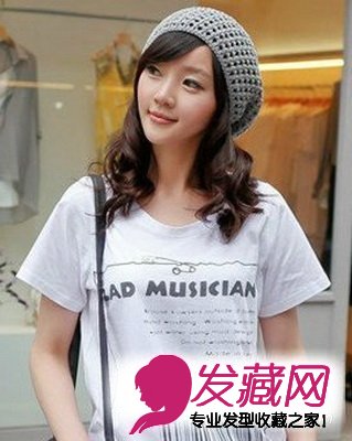 这款发型给人非主流时尚潮流的感觉,手工编辑的网状灰色毛线帽子很好的装饰整个发型,添加时尚潮流的元素,斜分的刘海很好的修饰了脸型,中长发丝内卷外翘分成两股垂落肩头,整个发型配上女生休闲的服饰,给人不一样的视觉冲击。