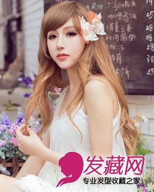 金棕色染发颜色的卷发发型图片,衬托出了女生白皙透亮的肌肤,随性披散的卷发发型,演绎优雅自然风情,搭配清新的斜刘海发型,更是美艳无比,侧边别上一个带蕾丝的蝴蝶结发饰,又不失甜美感觉。