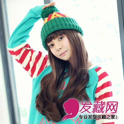 松修脸齐刘海卷发蓬,发梢处的微卷,美,很显气质,齐刘海将脸蛋修饰得超精致,搭上甜甜的帽子,更显可爱