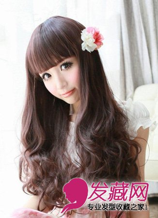 超甜美的齐刘海长卷发发型,细碎的卷发搭上了可爱的平刘海,绝对是一款超级显瘦的发型。再带上一款粉嫩的花朵,真的超级美的